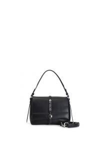 Flap with metal lettering detail. magnetic closure. removable shoulder strap