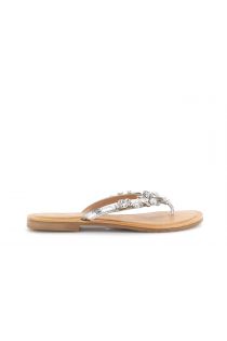 Flat flip-flop with a leather strap embellished with decorative jewel appliqués. anatomically shaped leather insole for everyday comfort and a low flexible 1.4 cm sole. an elegant and practical model ideal for completing casual or more sophisticated summer looks.