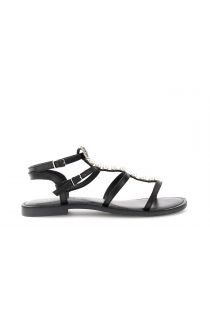 Flat leather sandals with a t-bar design embellished with decorative pearls. adjustable ankle strap leather insole and a 1.4 cm flexible sole. elegant and comfortable these shoes are ideal for everyday summer looks.