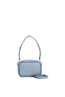 Frayed denim camera bag with stone and rhinestone flowers. zip closure. double shoulder strap