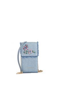 Mobile phone holder in frayed denim with stone and rhinestone flowers.