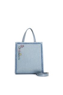 Tote with frayed denim handles with stone and rhinestone flowers. automatic magnetic closure. bag with one compartment. bag with shoulder strap.