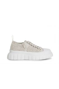 Frayed fabric lace-up sneakers. rubber toe. closure with laces matching the shoe. 55mm raised sole decorated with a striped pattern.