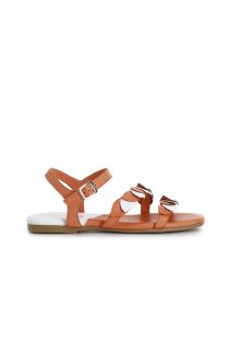 Low leather sandals with double strap gilda model and two-tone front decoration resembling interwoven leaves.