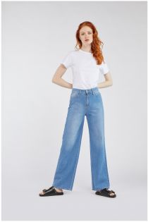 Gina wide leg trousers in firm denim canvas with offset rear pockets that create a particular contrast with the main wash of the garment.