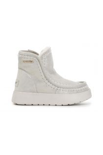 Glitter suede ankle boots with faux fur lining. Metal logo and elevated sole. The trim is embellished with visible stitching.