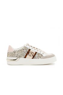 New sneakers with box sole and metal-effect logo inserts. The upper is made of glitter fabric and a side band with a metal CafèNoir monogram. In a word: shiny!