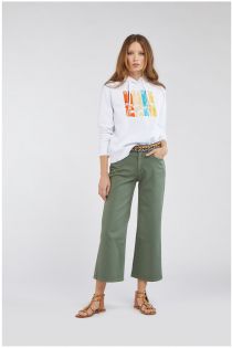 Greta culotte jeans made of bull denim enriched with multicoloured ethnic ribbon. The Greta model is bold in its simplicity. Just like you.