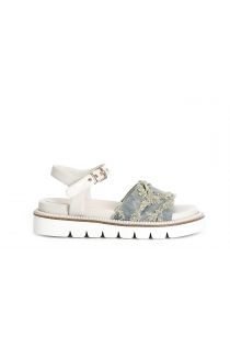 Guild model sandals in denim fabric enriched with rhinestones and studs. the wedge is 2.9 cm high. a shoe that combines style practicality and versatility. perfect footwear for summer to wear with long wide skirts.