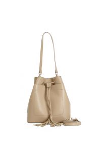 Hammered leather bucket bag with front pocket drawstring closure with leather tassels. bag with shoulder strap.