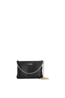 Comfortable clutch bag in textured leather with double chain shoulder strap. zipper closure.