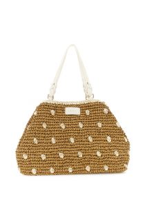 Hand-woven crochet shoulder tote with a refined artisanal design. it features a magnetic closure a lobster clasp for adjustable waistbands and a gold-foil embossed logo tag. perfect for summer. dimensions: 44 cm (length) × 31 cm (height) × 15 cm (depth).