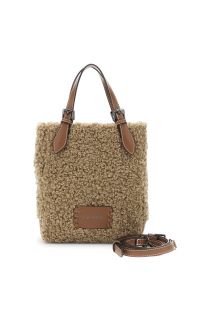 Curly fabric handbag with contrasting faux leather details, a studded plaque, and logo. Removable shoulder strap for versatile portability.