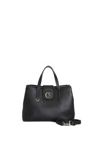 Hammered leather bag with flat handles zipped partition and decorative flap with logo. equipped with a removable shoulder strap for versatility and elegance.