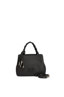 Handbag with woven mignon handle and tone-on-tone rectangular embossed logo. bag with double compartment and an internal zip pocket. zipper closure. bag with shoulder strap.