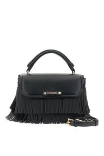 Faux leather handbag with a flap and decorative fringes, a metal logo on the front, an internal divider, and a removable shoulder strap for a versatile and bold style.