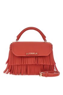 Faux leather handbag with a flap and decorative fringes, a metal logo on the front, an internal divider, and a removable shoulder strap for a versatile and bold style.