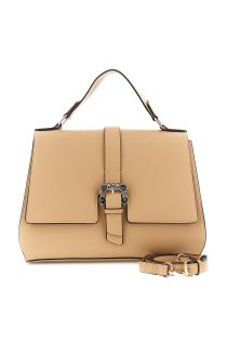 Faux leather handbag with flap and jewel buckle, contrasting ribs, internal partitions, back pocket and removable shoulder strap for chic versatility.