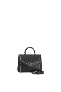 Handbag with golden metal chain application and cafènoir logo. metal handle with tube. magnetic closure. removable shoulder strap.