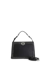 Handbag with rivet applications and metal closure. bag divided into various compartments: a partition closed with a zip and a small pocket with a zip. removable shoulder strap