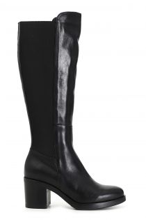 high-heeled leather boots with stretch panel on the back