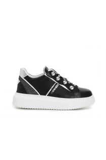 High-top leather sneakers with glitter and patent leather inserts. The laces are decorated with maxi rhinestones. Slim and linear running sole with metal logo on the outer side