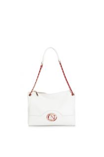 Hobo bag with multicoloured oval enamel logo and strung chain. shoulder strap with threaded chain. zip closure.