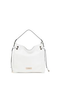 Hobo bag with statement decorative stitching on the front and tied strings on the sides