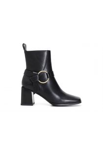 Imitation leather ankle boots with circular metal hardware serving as an ankle strap. Square heel.