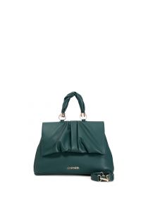 Semi-rigid, imitation leather satchel with flap enhanced by soft pleating and twisted handle.