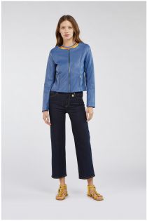 Short imitation leather jacket with printed lining, with no collar and enhanced with a pattern of seams that shape the centre front and back.