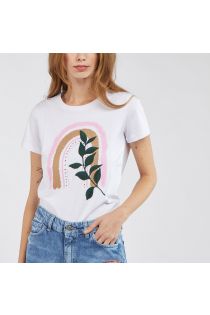 Cotton jersey T-shirt in a vaguely ethnic style with a floral pattern of embroidered leaves that cross an arc printed in soft colours.