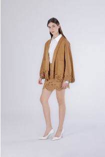 Faux suede kimono jacket with elegant laser-cut hem and sleeves. flowing lines and a refined design ideal for contemporary looks. perfect for pairing with casual or more sophisticated outfits. the model is 171 cm tall and wears a size s. comfort fit.