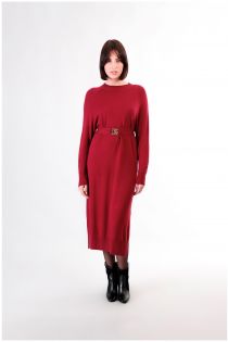 Crew-neck knit dress. made of cashmere blend yarn. calf length side slits and belt with logo buckle. perfect to be worn with any combination.