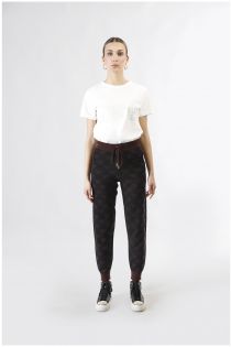 Jogger trousers in warm and soft wool blend yarn. stockinette stitch with jacquard logo processing. perfect piece that adds a touch of style to your winter wardrobe.