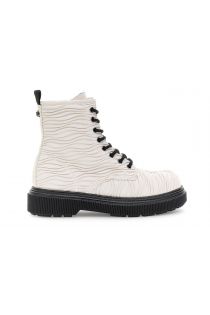 Women's lace-up ankle boots in pleated faux leather with eight eyelets and an internal zip. Fabric lining and sturdy 4 cm sole. Original design for urban looks.