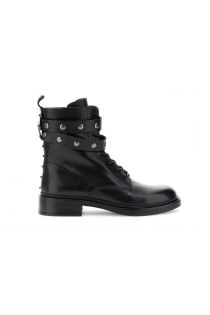 Black leather lace-up ankle boots with a snap-button strap. Leather insole and 4 cm heel. Bold style, perfect for bold, contemporary looks.