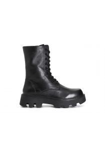 Women's solid-colour leather lace-up ankle boot. leather insole and lug sole.
