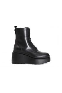 Women's leather lace-up ankle boot with platform and heel. leather insole and wedge sole customised with embossed logo on the back.
