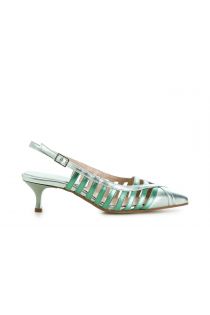 Dècollète in laminated leather with a play of side bands made with a darker but matching shade of color. Buckle on the back and medium heel