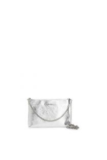 Comfortable clutch bag in laminated leather with double chain shoulder strap. wax closure.