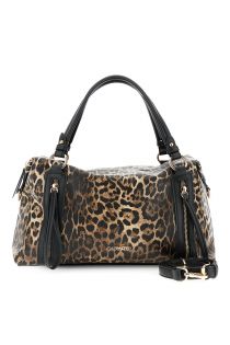 Leopard-print leather-look satchel bag with a zip charm and metal lettering. A removable shoulder strap and black details create a bold, sophisticated look.