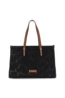 Large elegant macramé shopping bag with contrasting leather-effect handles and tags. spacious and versatile finished with metal loops it's ideal for summer city and leisure looks. dimensions: 40 cm (length) × 28 cm (height) × 15 cm (depth)