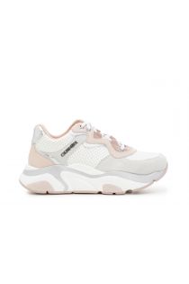 Leather and satin sneakers with coloured inserts on the sole that match the colours of the upper. Side logo and a delicate pattern of micro polka dots decorate the item