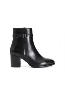 Women's leather ankle boot with an ankle strap and buckle. the heel is 65mm. comfortable leather insole.