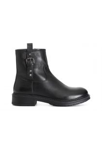 Leather ankle boot embellished with a buckle and stud detail. the heel is 35mm. the insole is leather.