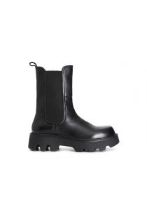Women's solid-colour leather ankle boot with side stretch panel. leather insole and lug sole.