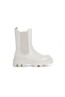 Women's solid-colour leather ankle boot with side stretch panel. leather insole and lug sole.