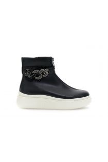 Leather ankle boots with side chain accessory and internal zip. Fabric lining, leather insole, 4 cm platform sole. Bold, versatile and ultra-comfortable.