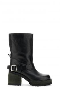 Black leather ankle boots with ankle strap and buckle, 9 cm high heel, suede-effect covering, and lug sole. Zip interior and leather insole. Bold and stylish for winter.